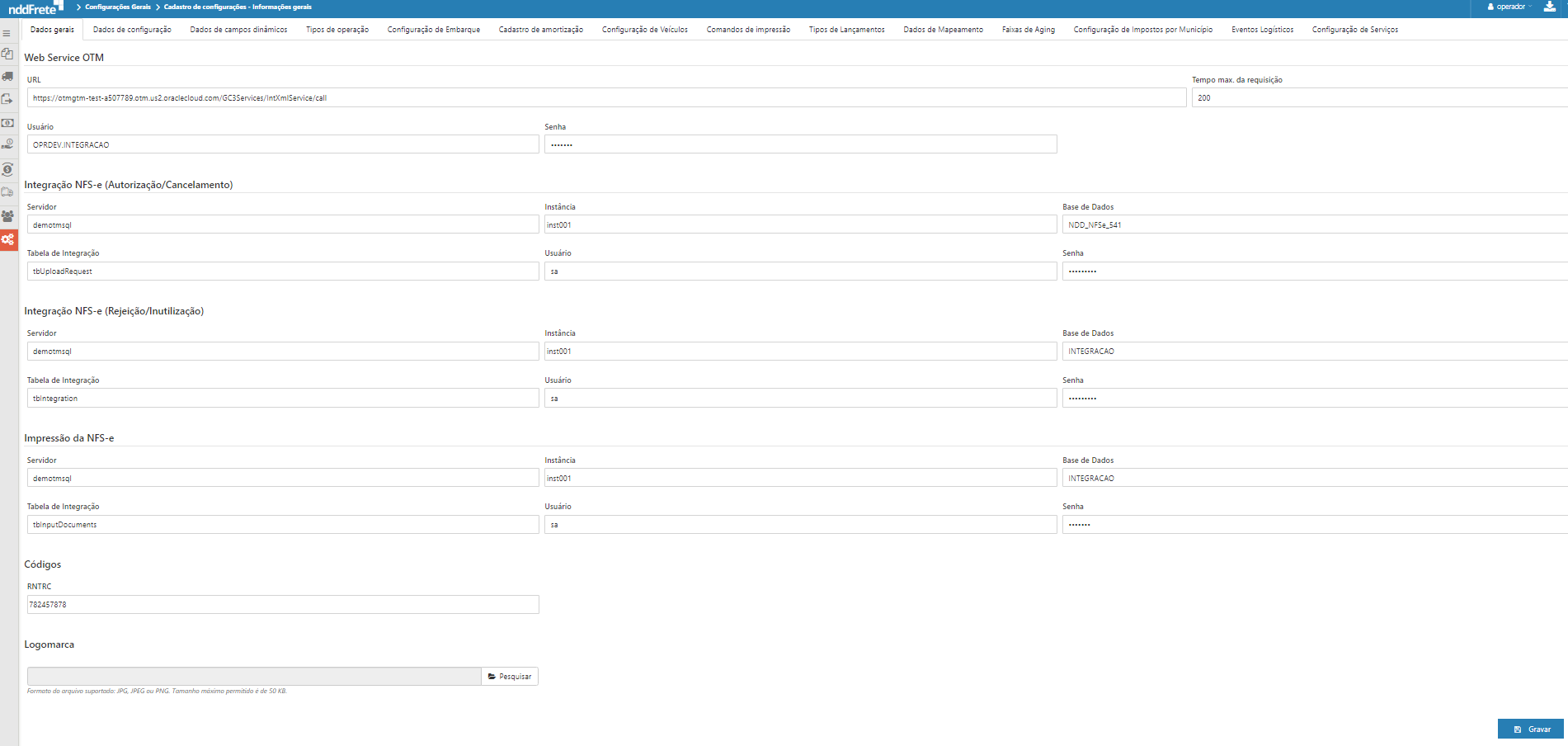 Na aba “Dados gerais”, estão disponíveis as configurações para integração com o OTM, Integração NFS-e, Código RNTRC do operador logístico e logomarca do mesmo.