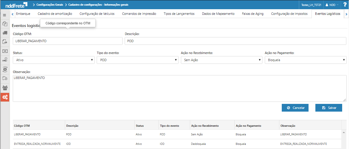 Na aba “Eventos Logísticos” são cadastrados os códigos de eventos relacionados a atualização dos shipments ou suas paradas. Estes eventos podem ser IOD e POD e irão afetar diretamente no processo de faturamento automático, permitindo bloquear ou liberar o faturamento.