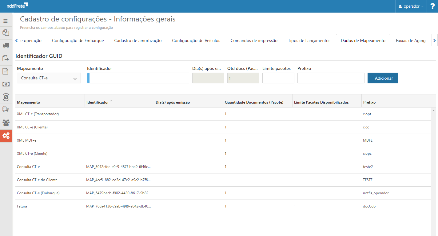 Na aba “Dados de Mapeamento” estão disponíveis os mapeamentos para o operador logístico.