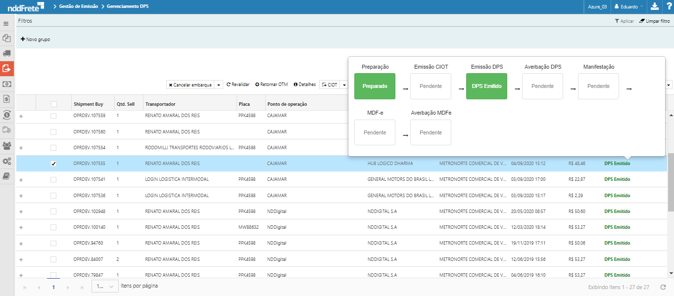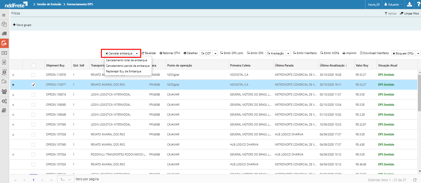 •A situação atual do documento dever ser DPS emitido e pelo menos um DPS do embarque deve ser do tipo "normal". Não é permitido para CTe substituto ou complementar;