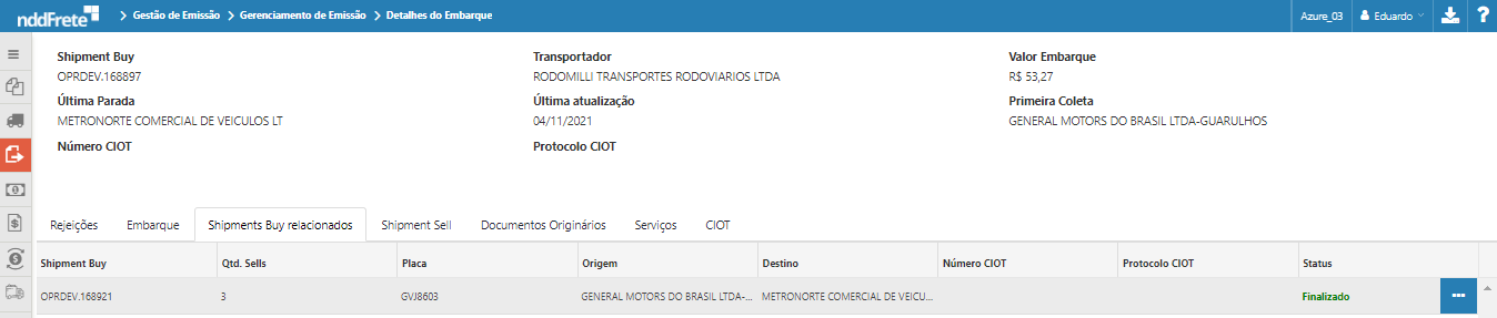 •Shipments Buy relacionados - Apresenta os shipments buy relacionados ao buy de embarque, ainda é possível através do menu de contexto da grid, visualizar os detalhes do shipment buy relacionado;