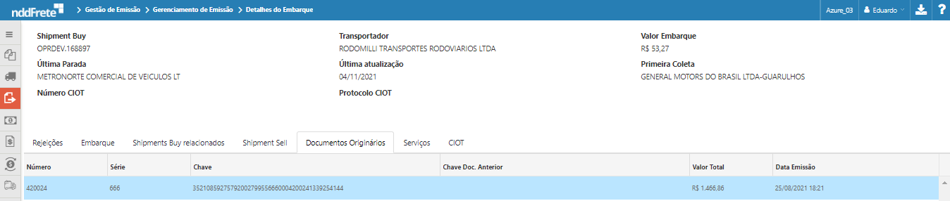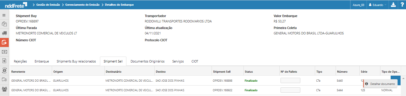 Na tela de "Detalhes do Embarque" é possível visualizar os dados do embarque selecionado, assim como inconsistências, shipments buy, shipments sell e documentos originários relacionados a ele.