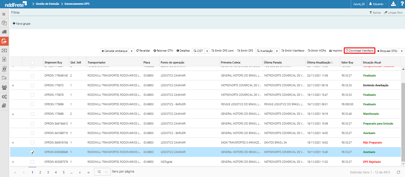 O download do manifesto só é permitido para shipment buy com placa e que possuem o status "Manifestado". |