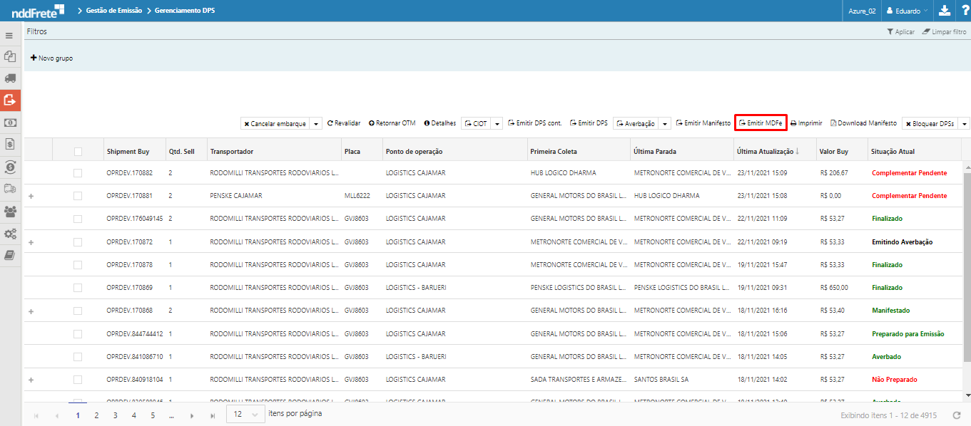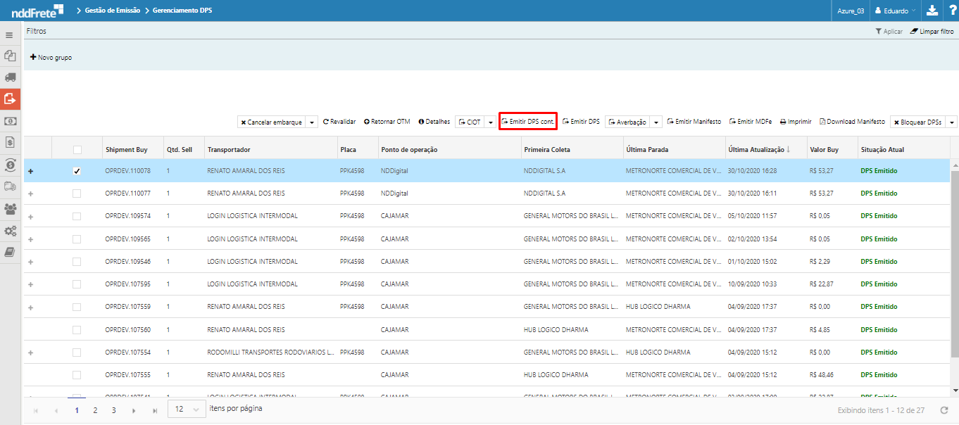 Na tela “Gerenciamento de emissão” é possível realizar a solicitação de emissão de DPS por meio do shipment buy.