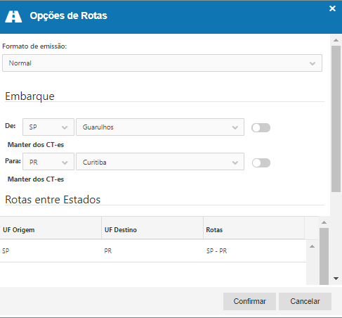 Em um cenário de cross docking, onde uma primeira parte do embarque é feita até um ponto de transferência, e um segundo embarque é feito do ponto de transferência para o(s) destino(s) final(is). No primeiro caso a origem será mantida dos CT-es, mas o destino é único para todos, deixando a opção marcada na origem e desmarcada no destino (sendo necessário informar o município no campo de destino). Na segunda parte do embarque o caso se inverte, sendo origem de um único município e o destino é dos CT-es. |