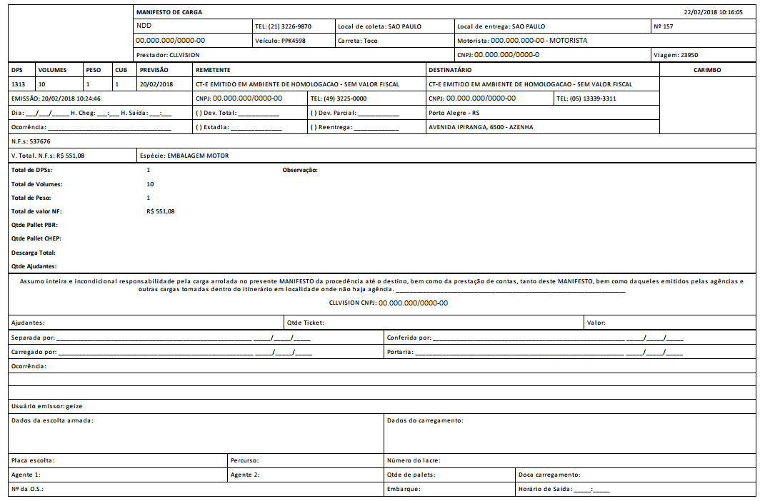 O manifesto é um documento não fiscal, portanto não é enviado para a SEFAZ, é usado apenas para controle interno. Caso o CT-e não esteja averbado, é necessário realizar averbação para o processo de envio. Será enviado para manifestação o shipment buy com placa. |