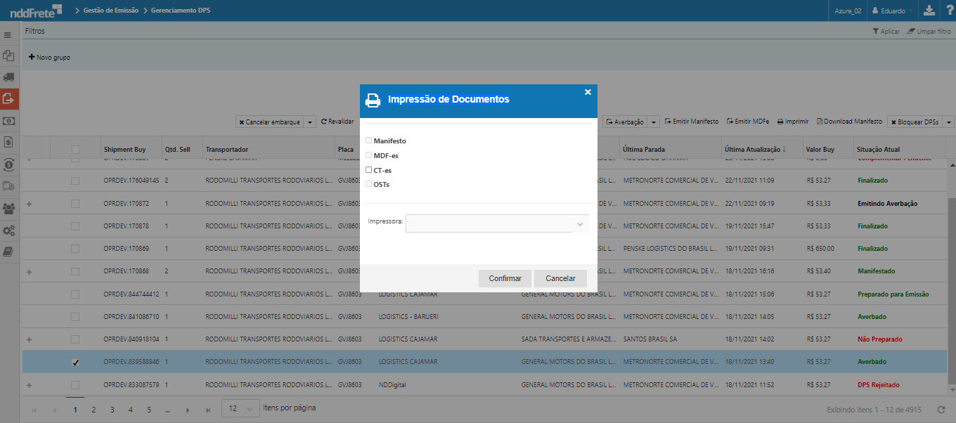 A impressora a ser seleciona é carregada do ponto de operação de cada documento. Caso selecionado múltiplos documentos, será determinado o ponto de operação de acordo com o primeiro registro selecionado.