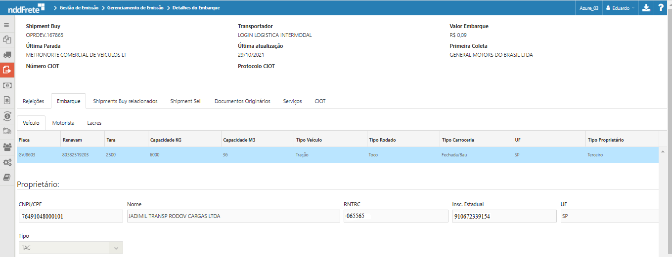 •Embarque - Apresenta informações gerais do embarque, como dados do veículo, motorista, dados de lacres de carga e informações do proprietário do veículo;