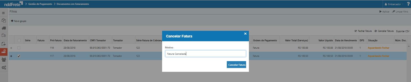 Ao clicar na ação "Invalidar", é possível cancelar somente faturas com a validação pendente e deve-se informar o motivo do cancelamento. Ao invalidar uma fatura, os documentos que pertencem a mesma retornam para pagamento e a fatura fica com a validação inválido.