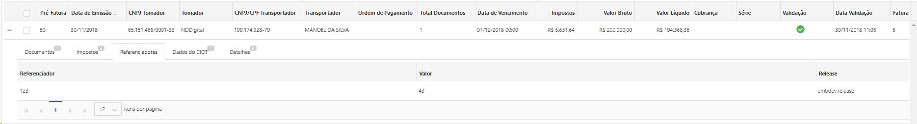 Os referenciadores são exibidos apenas para documentos que possuem vinculo com a release, por exemplo, nota de débito e NFS-e que forem geradas a partir de custo acessório do embarque não serão exibidos os referenciadores. |