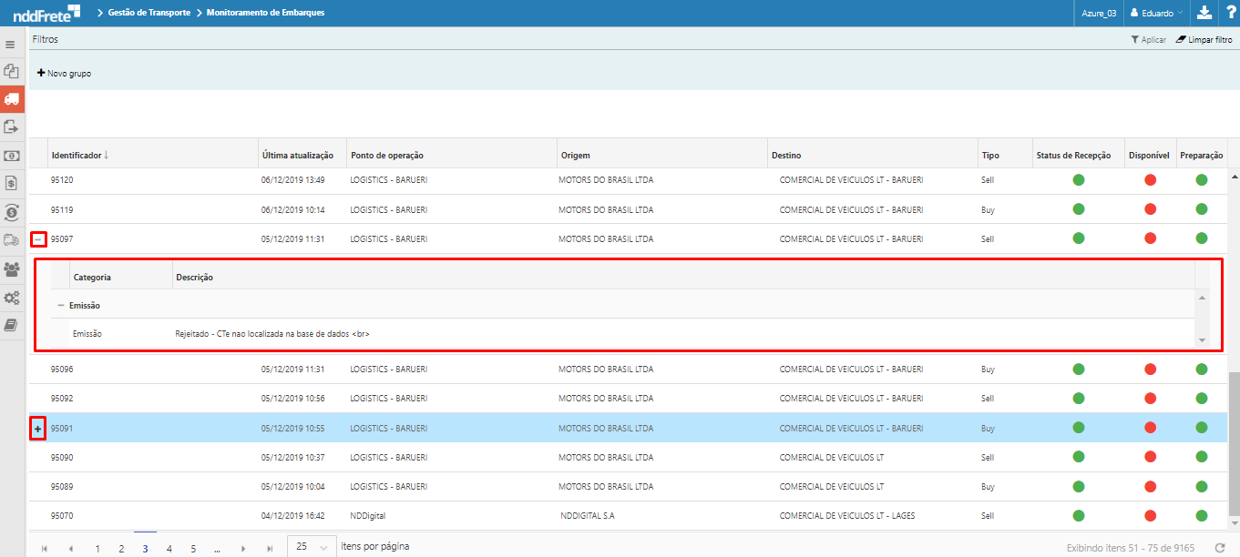 Ao recepcionar um embarque do OTM na aplicação nddFrete, estes ficam disponíveis para visualização no monitoramento de embarque.