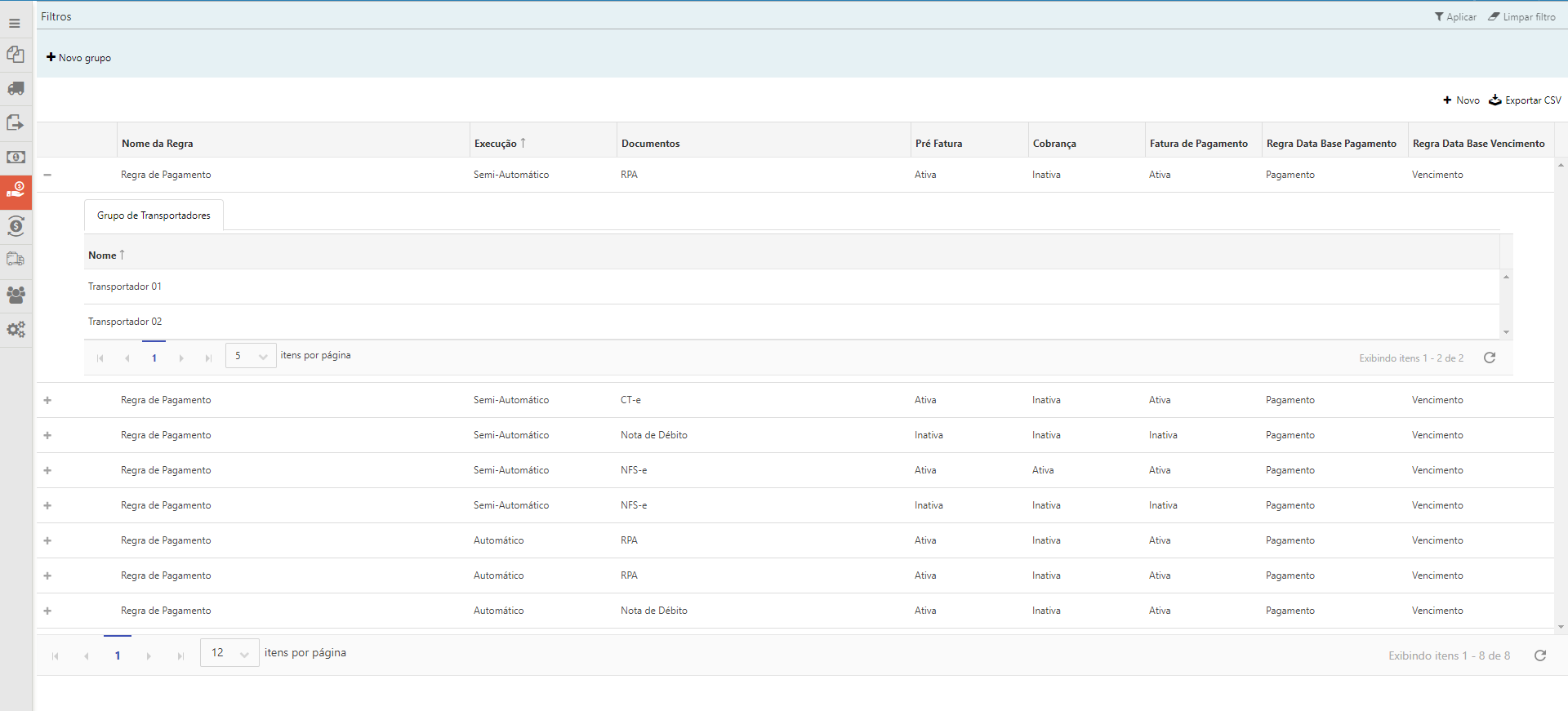 Configuração de Regras de Pagamento - Grupos Transportadores |