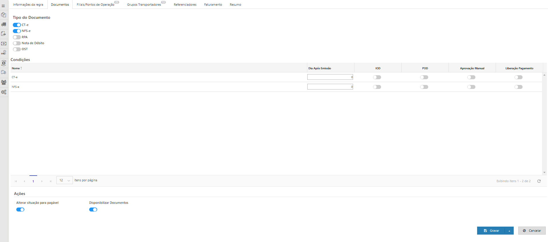 •Documentos: Documentos configurados na regra (CT-e/NFS-e/Nota de débito ou CIOT);