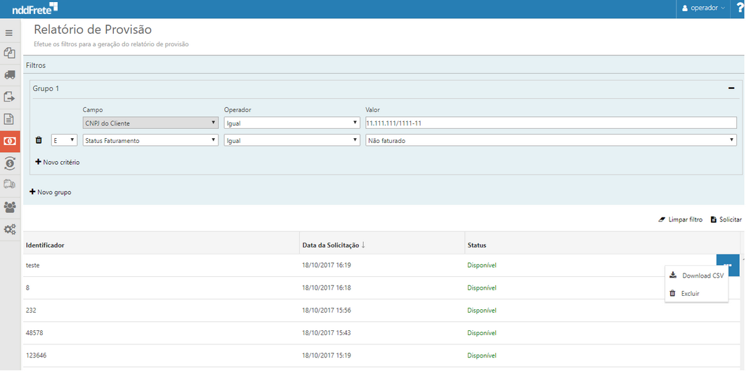 localizada no menu de contexto da grid, permite realizar o download do relatório de provisão no formato CSV.