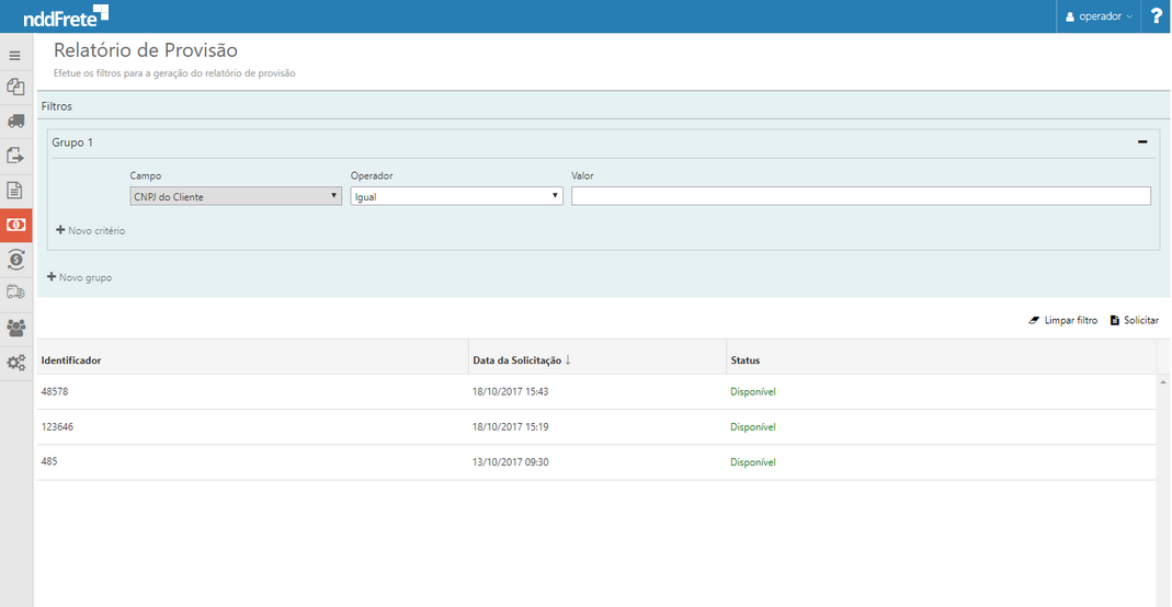 Após realizar o preenchimento do filtro, deve-se selecionar a opção "solicitar", localizada abaixo da grid, para que seja solicitado a geração do relatório de provisão com as informações aplicadas no filtro.