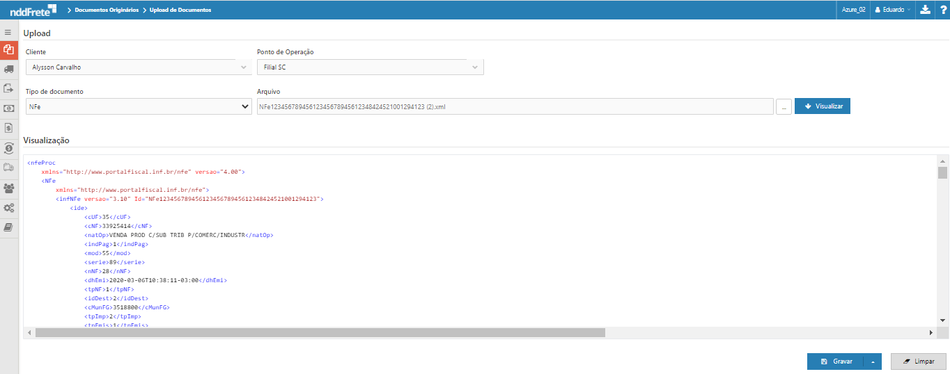 •Cliente - Indica a qual cliente, cadastrado na aplicação nddFrete, pertence o documento.