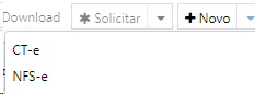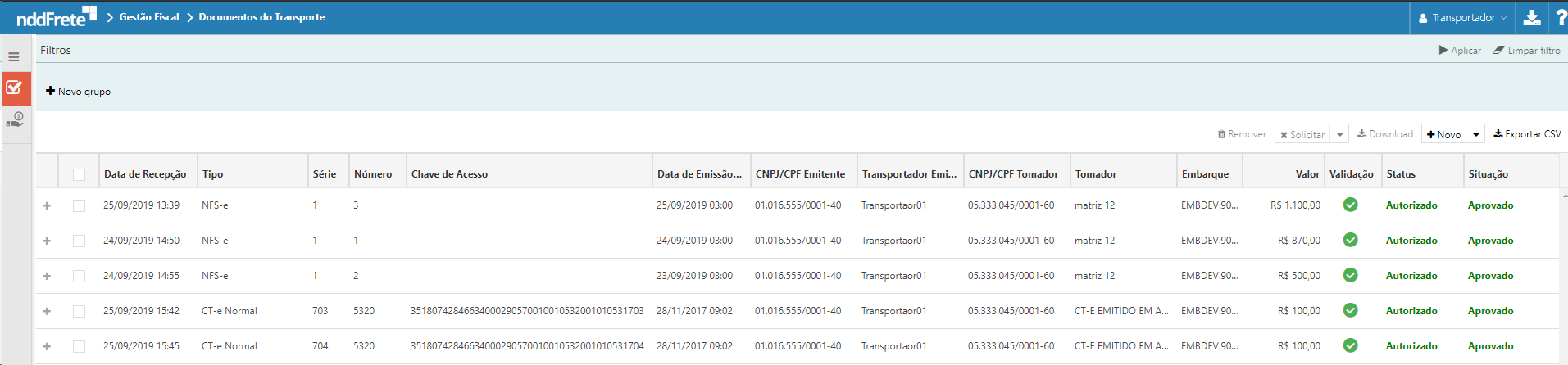 O Painel de botões da tela de Documento do Transporte é constituído por Remover, Download, Solicitar, Novo, Exportar CSV.