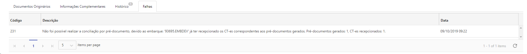 Exemplo de mensagens de erro no processo de conciliação: