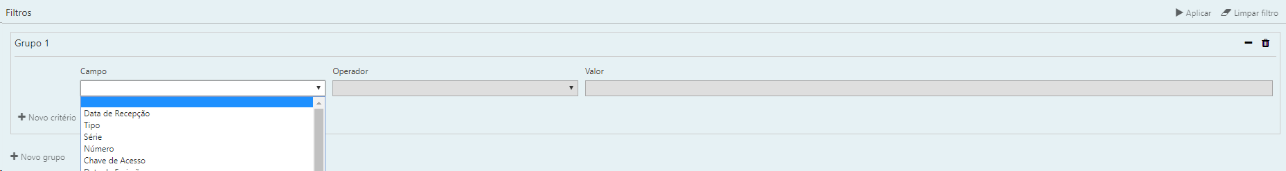 As opções para realizar filtros é determinada pelas colunas da tabela e colunas dos detalhes de cada registro, conforme é representado logo abaixo: