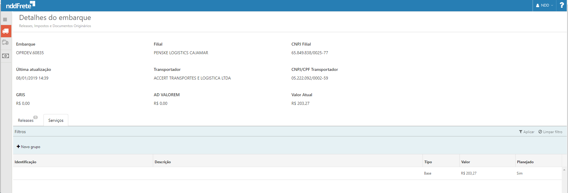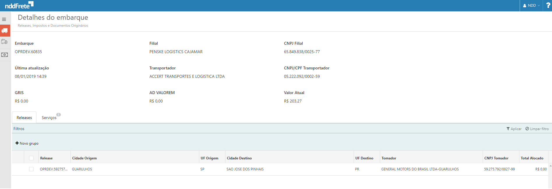 Na opção Detalhes: Apresenta informações referentes aos detalhes do embarque selecionado, nela é exibido o cabeçalho contendo as principais informações do embarque. Abaixo encontra-se as abas Releases e Serviços.
