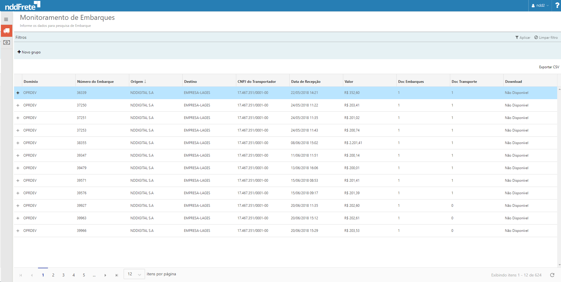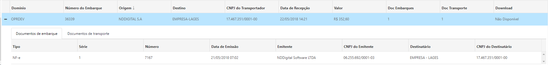 Nessa tela é possível acompanhar todos os embarques registrados no sistema NDDFrete, que obtiveram regularidade quanto aos requisitos para validação, bem como visualizar os documentos relacionados a ele.