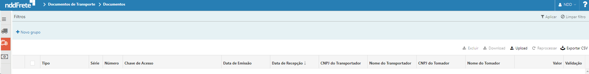 Para acessar as funcionalidades da tela de monitoramento de documentos do transportador processados: Menu principal>Documentos de Transporte>Documentos.