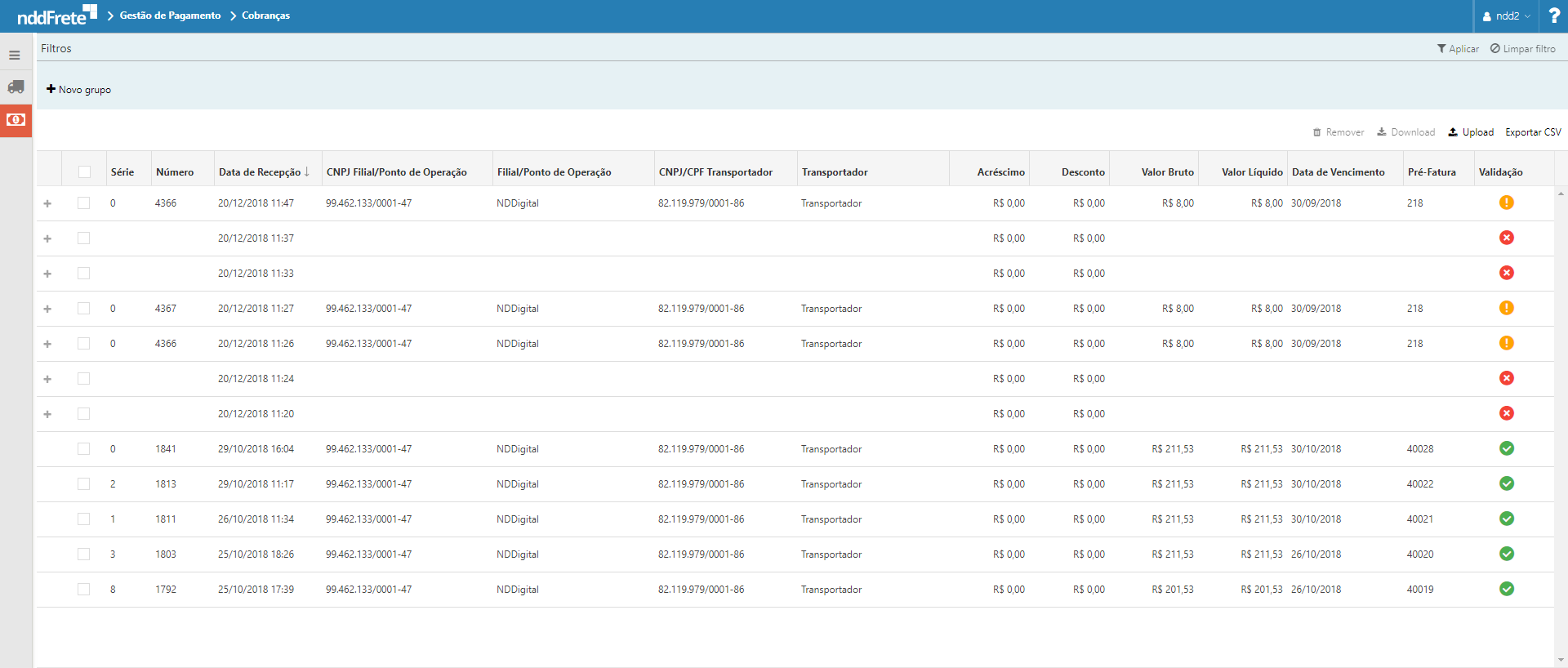 Ao clicar no botão "Download", possibilita que seja realizado o download do arquivo da fatura de cobrança, está ação está disponível apenas para faturas válidas, pendente e inválidas.