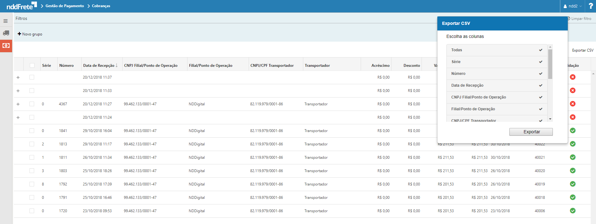 •Permite exportar as informações que estão sendo exibidas na grid em formato CSV; •Considera-se o filtro e/ou a ordenação aplicada no momento da exportação das informações; •Permite definir quais as colunas devem ser exportadas. •Será exibido o ícone de notificação apenas se os DPSs da fatura estiverem inativos. |