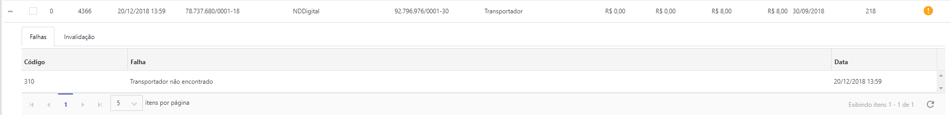 Na aba "Falhas" será apresentado o código da falha e o motivo pelo qual a fatura de cobrança está pendente ou inválido: