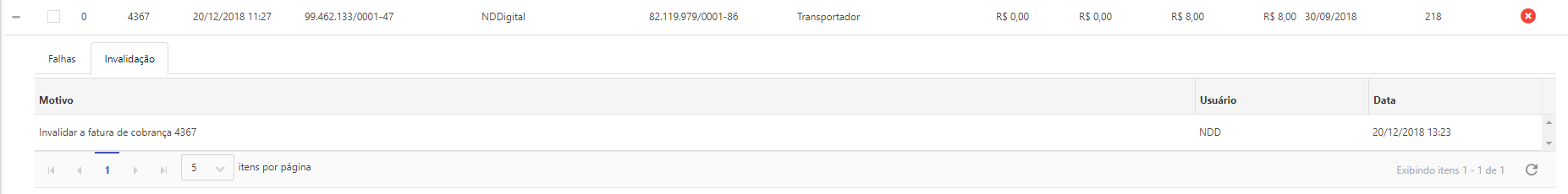 A aba "Invalidação" apresenta o motivo e usuário que invalidou a fatura de cobrança: