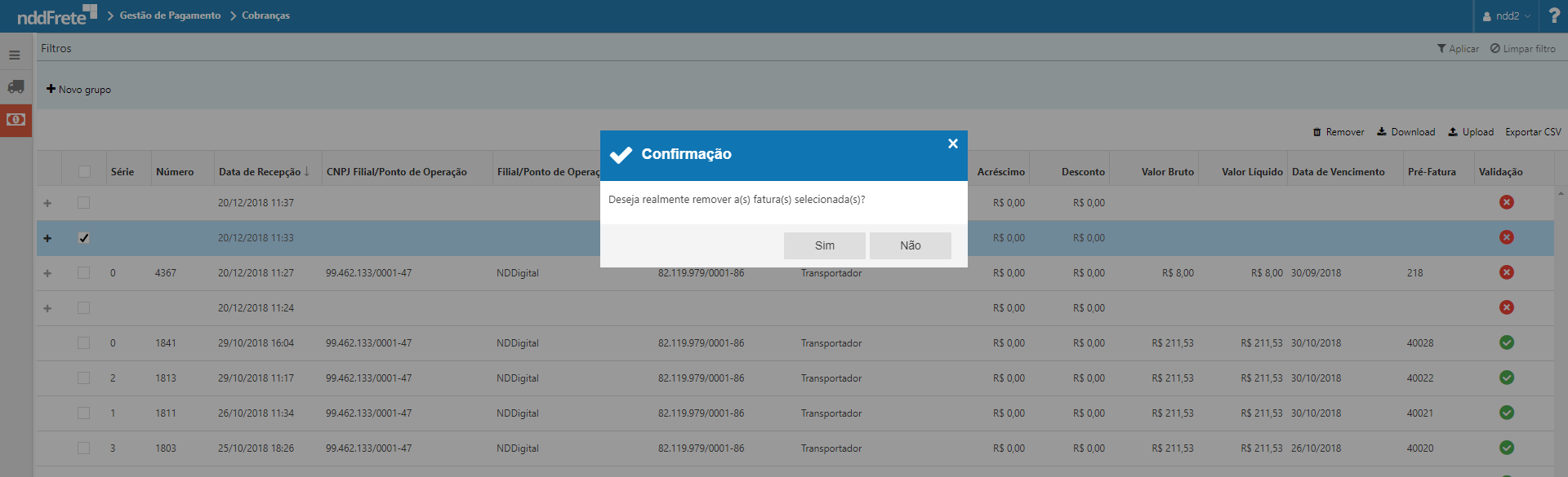 Somente é possível remover faturas com o status da validação igual a Pendente ou Inválido. |