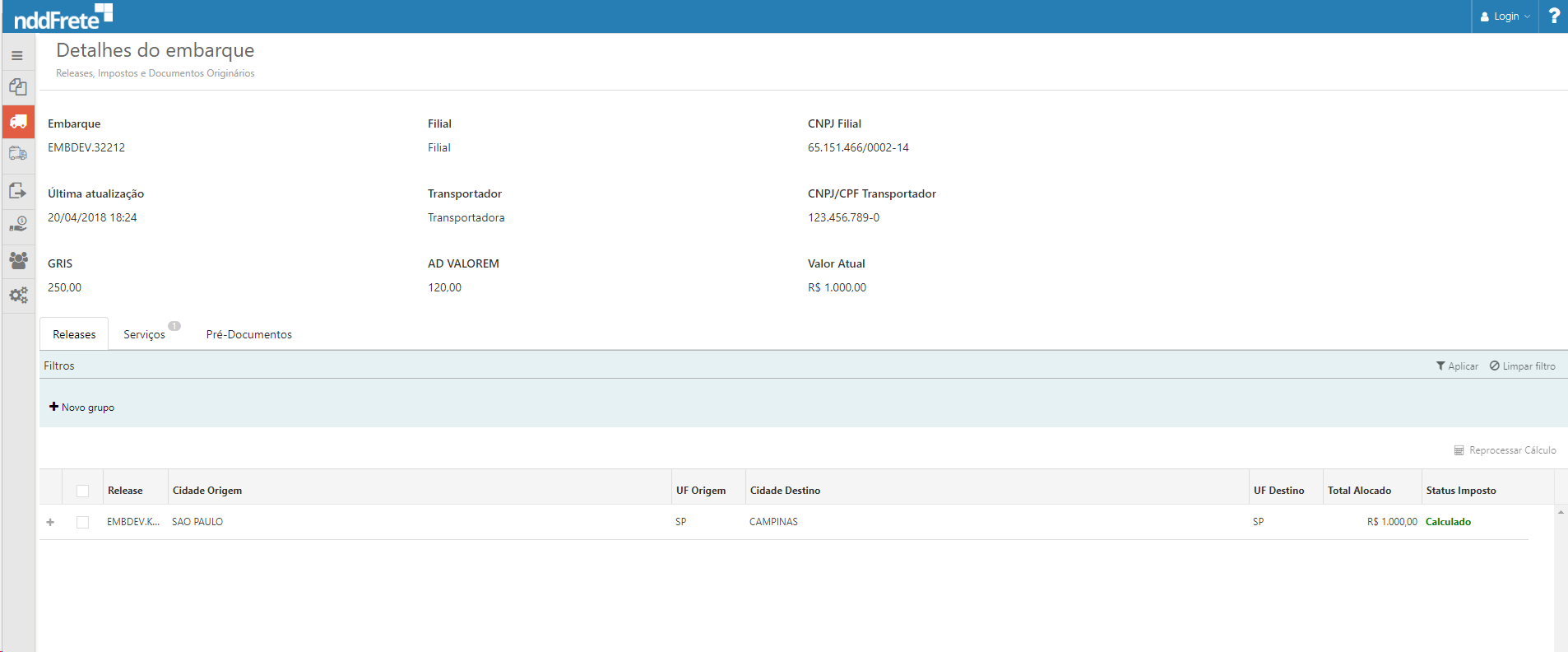 Através da aba Releases é possível visualizar todas as releases vinculadas ao embarque selecionado, bem como o total alocado em cada Release e o status do imposto, o qual possui os seguintes status possíveis no sistema NDDFrete: Aguardando Cálculo, Sem cálculo, Falha no cálculo e Calculado.