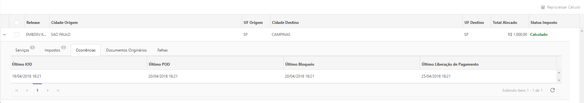 •Ocorrências: Nessa aba é possível visualizar todas as ocorrências geradas para Release vinculada ao Embarque selecionado.