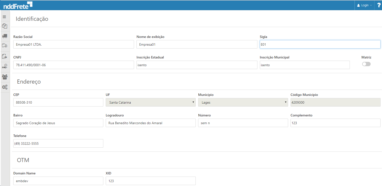 •OTM: Deve ser informado os campos DomainName e XID, os quais são referentes às configurações OTM.
