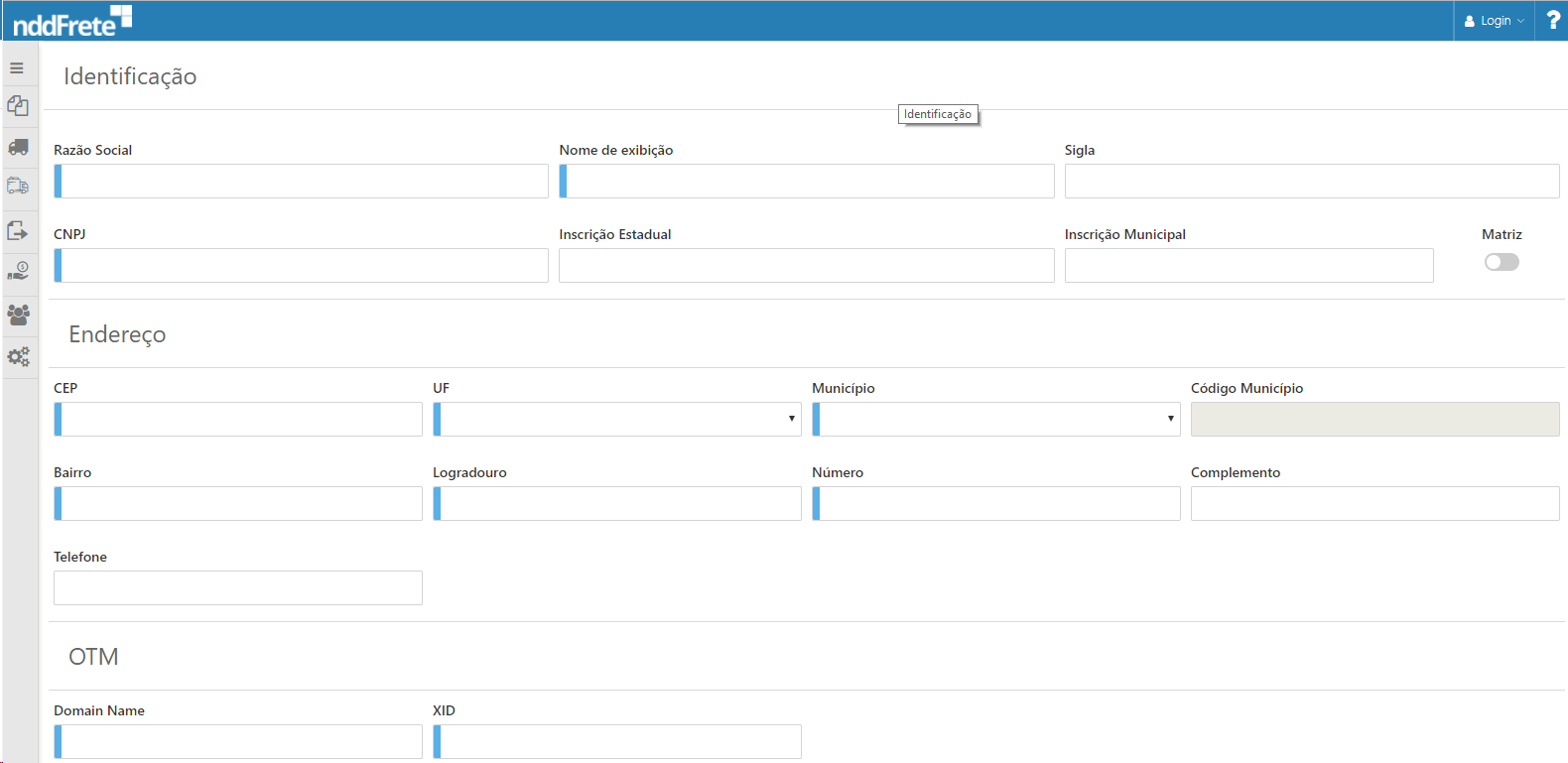 •Os campos apresentados em destaque, através da faixa azul lateral, são obrigatórios na realização de um novo cadastro. •É permitido o cadastro de duas filiais com o mesmo CNPJ, pois é controlado o cadastro das filiais através do DomainName e Xid, onde não é permitido ter duas filiais com o mesmo DomainName e Xid. •Ao informar um CEP válido, os campos UF, Município, Código do Município, Bairro e Logradouro são preenchidos automaticamente, caso contrário, devem ser preenchidos manualmente. •Pode ser cadastrado mais de uma filial matriz, desde que o CNPJ raiz seja diferente das filiais já cadastradas. |