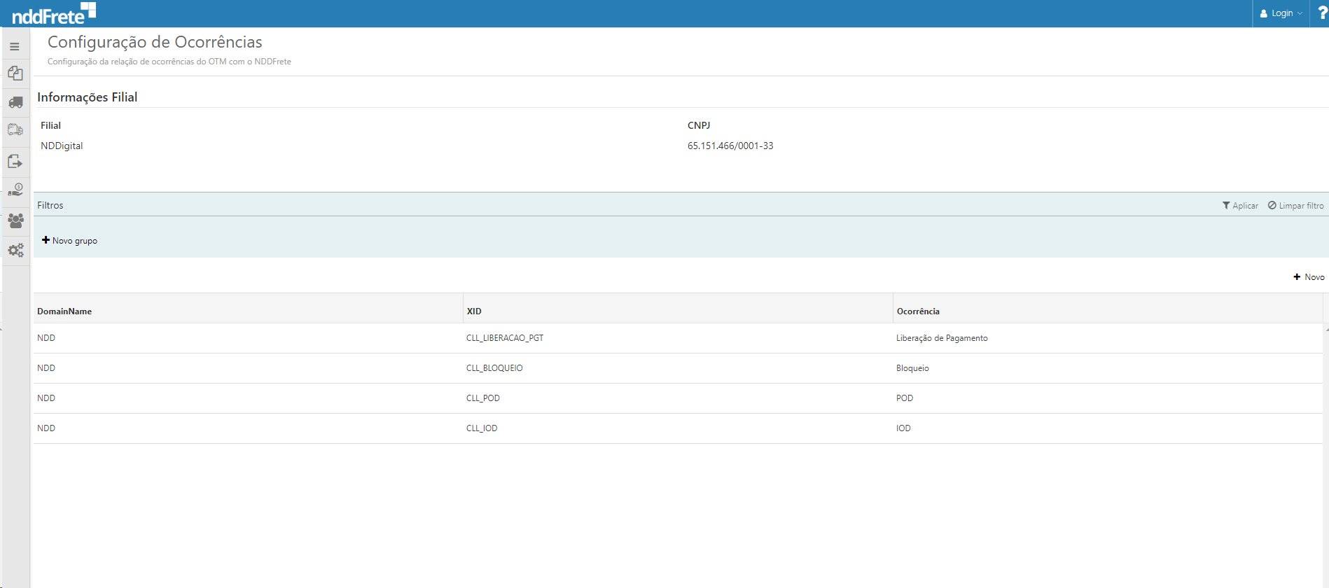 Através da opção Ocorrências, do menu de contexto da filial, é possível acessar a tela de configurações da relação de ocorrências do OTM com a solução NDDFrete.