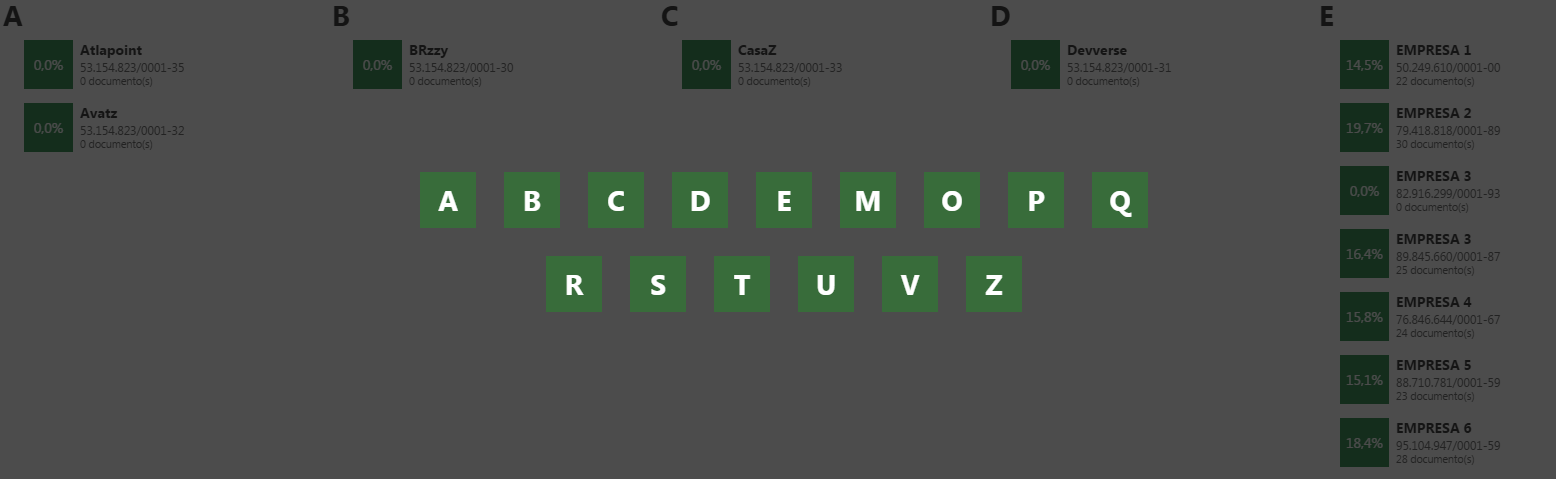 As empresas são organizadas em ordem alfabética pelo nickname, Nome Fantasia ou Razão Social, vinculados a ela no Portal de Configurações. Para localizar de forma rápida uma empresa, é possível clicar sobre as letras que organizam a lista, e então selecionar a letra inicial da empresa, no teclado virtual.